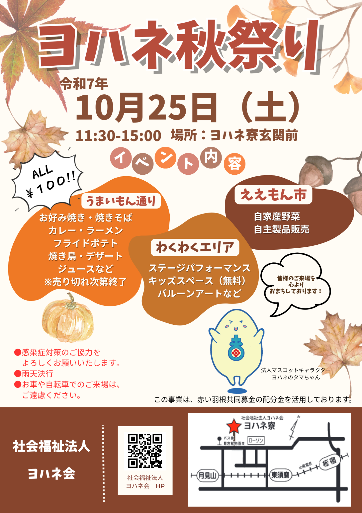 10月25日にヨハネ祭を開催します。ヨハネ寮寮生と職員が一緒に祭を盛り上げていきます。ヨハネ寮で収穫した野菜の販売や、作業所で作った製品販売、ステージボランティアによるパフォーマンスもあります。たくさんのご来場をお待ちしておりますので、ぜひ楽しんでください。