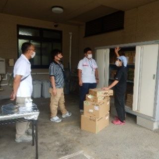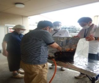 屋外でプロパンガスに火をつける→お湯を沸かす→備蓄している非常食に湯を注ぐ→寮生一人ひとりに手渡す。