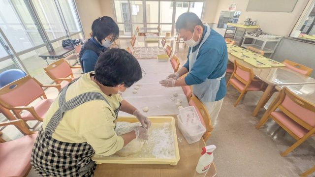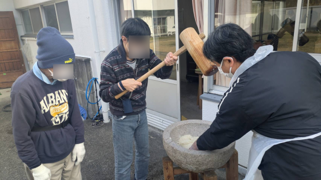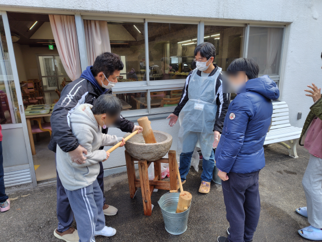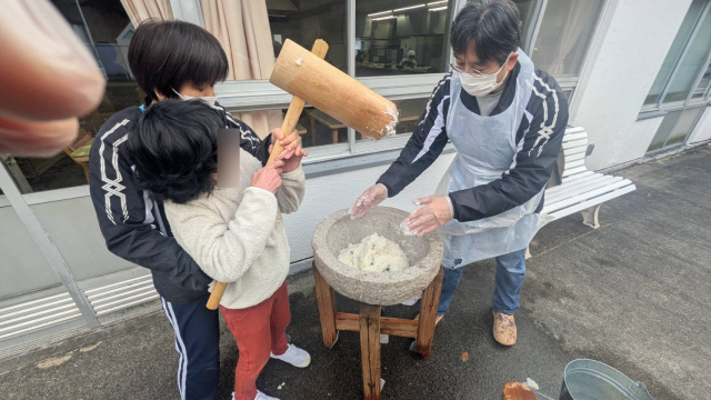 利用者さんと職員が力を合わせて「ぺったんぺったん」楽しみながら突きました。